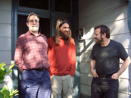 | Keith and Andrew McNaughton with Jim Falk at Jim’s house in Williamstown. Keith and Andrew met there when Keith was in Australia to meet Johannes Laubach and choose a site for their experiment in South Australia. |