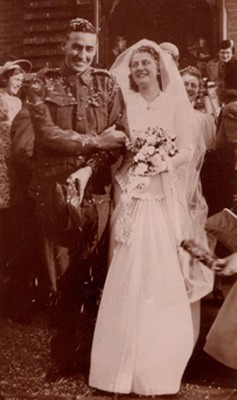 | Wedding 15 Aug 1942, during World War II. Behind them: on the left: Barbara Ayers; on the right: Frances Ayers and, further back Kathleen Vaughan nee Casement. Frank and Frances were both home on-leave from the army. |