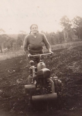 Audrey working with the rotary hoe at Cardiff Grange during World War 2.